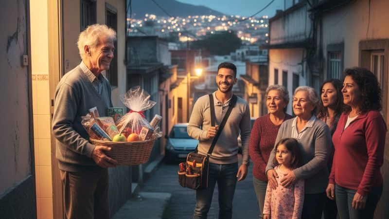 Men da en lokal elektriker, der egentlig havde holdt fyraften for at fejre jul med sin familie, hørte om Manuels situation via en nabogruppe på WhatsApp, tøvede han ikke. Han mødte op juleaften, fiksede fejlen gratis, og inden længe havde naboerne samlet en kurv med mad og julegodter, som de leverede til Manuel. Da lyset blev tændt, og Manuel så sine naboer stå i døren med julesange og mad, var der ikke et øje tørt. Det blev en påmindelse om, at det største lys findes i vores omsorg for hinanden.