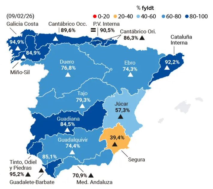 De spanske vandreserver fortsætter deres spektakulære opsving efter de seneste ugers vedvarende regn, som stormen "Leonardo" har ført med sig. For anden uge i træk slår tallene historiske rekorder for denne årstid, og den samlede vandmængde i landets reservoirer overstiger nu 43.000 kubik-hektometer (hm³).