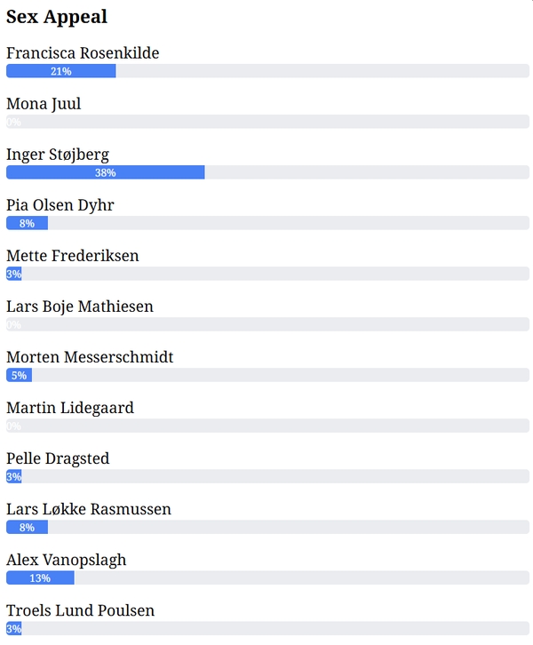 Denne afstemning gik ud på at vælge den partileder, der er den klogeste, mest fleksible, mest humoristiske, har mest Sex Appeal, er den sødeste mod børn og den, som du allernødigst ser som statsminister?