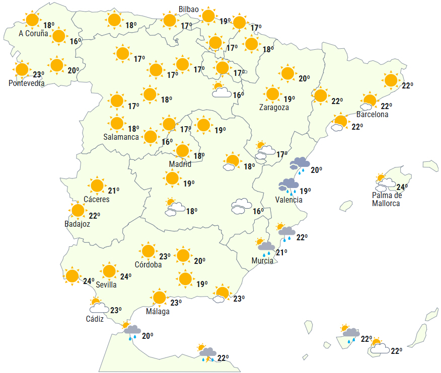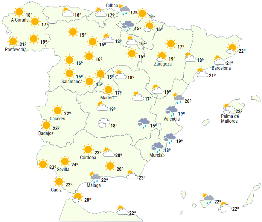 Letskyet til overskyet. Der forventes byger, som lokalt kan være kraftige eller meget kraftige og vedvarende ledsaget af torden, mere sandsynlige og intense ved kysten. Nattemperaturer kun med svage ændringer, mens dagstemperaturerne falder i indlandet og er uden ændringer i resten af provinsen. Det betyder 18 til 24 grader og 13 til 18 om natten.