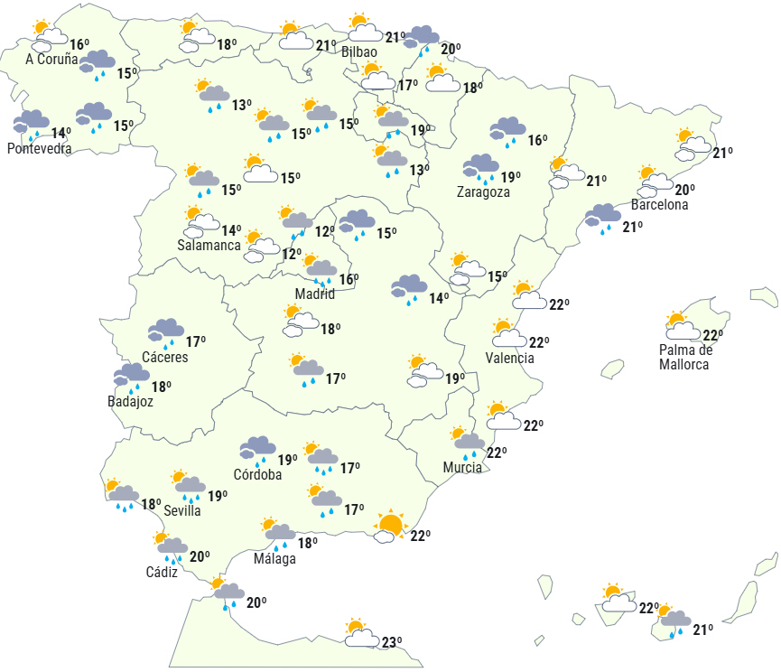 Dagstemperaturerne er i let stigning i dalene i nordøst og ved Middelhavskysten, mere udtalt i Melilla, hvor man overstiger 30 grader. De vil til gengæld falde på De Kanariske Øer, i det centrale nord og i indlandsområder af den sydlige halvdel af fastlandet - lokalt bemærkelsesværdige fald i det sydlige højland og Andalusien. Få ændringer i resten.