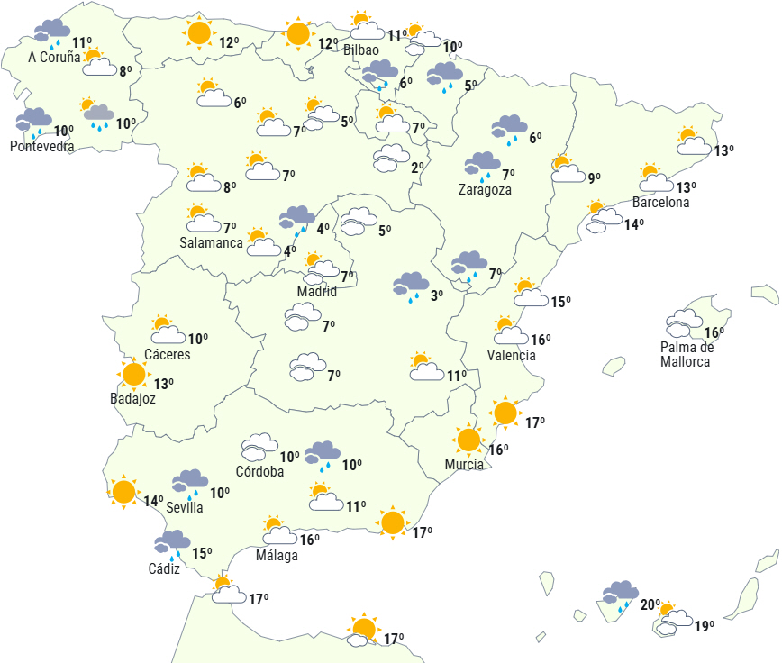 Fronten, som kom ind den foregående nat fra nordvest, vil krydse Den Iberiske Halvø og give skyet eller overskyet himmel undtagen på Middelhavssiden og De Baleariske Øer, hvor der vil være letskyet.