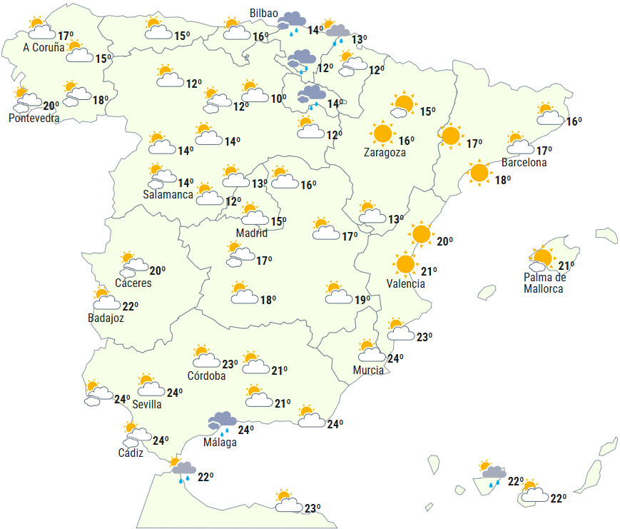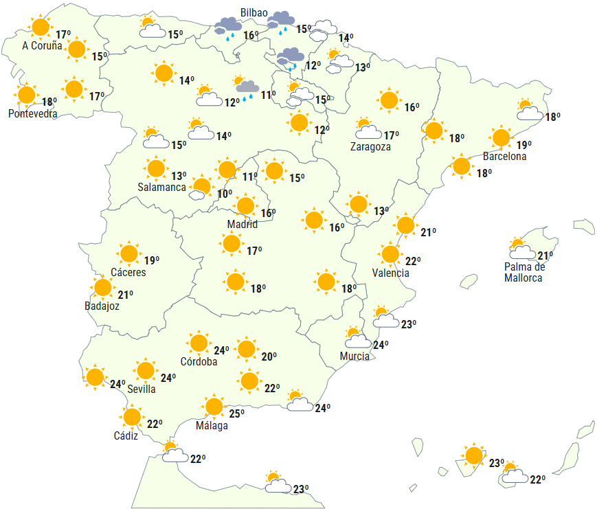 På den anden side vil højtrykket brede sig over Den Iberiske Halvø med en tendens til stabilisering på atlanterhavssiden og overvejende klar himmel generelt. Om eftermiddagen kan der komme flere skyer over den nordlige og østlige tredjedel, og det kan give lejlighedsvise byger i bjergområderne i det nordlige centrum og helt i sydøst.