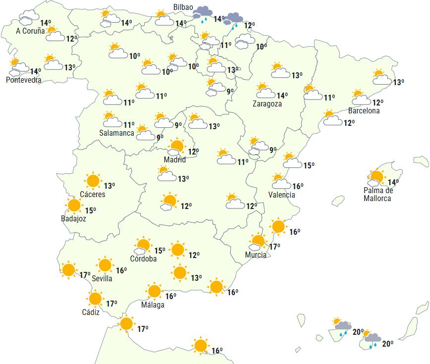 Der forventes en stabil situation på Den Iberiske Halvø med overvejende klar eller skyfri himmel bortset fra over den nordlige tredjedel, hvor der vil være letskyet eller overskyet med sandsynlighed for svage og lejlighedsvise byger i det nordlige Galicien, De Iberiske Bjerge, den øvre Ebro-dal, Cantabrien og Pyrenæerne, hvor det vil sne i højder, der stiger fra 800/1.000 meter op til 1.500/1.800 meter.