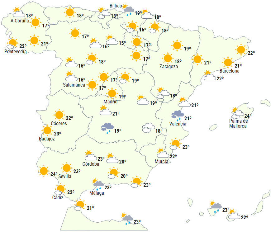 Perioder med skyet himmel, og vi kan ikke udelukke svage og lejlighedsvis byger - mere sandsynlige og intense i bjergkæderne om eftermiddagen. Temperaturer uden ændringer ved kysten, men lette fald i indlandet. Nattemperaturerne er også i let fald her og der. Dermed lander vi på 24 til 26 grader og 14 til 20 om natten.