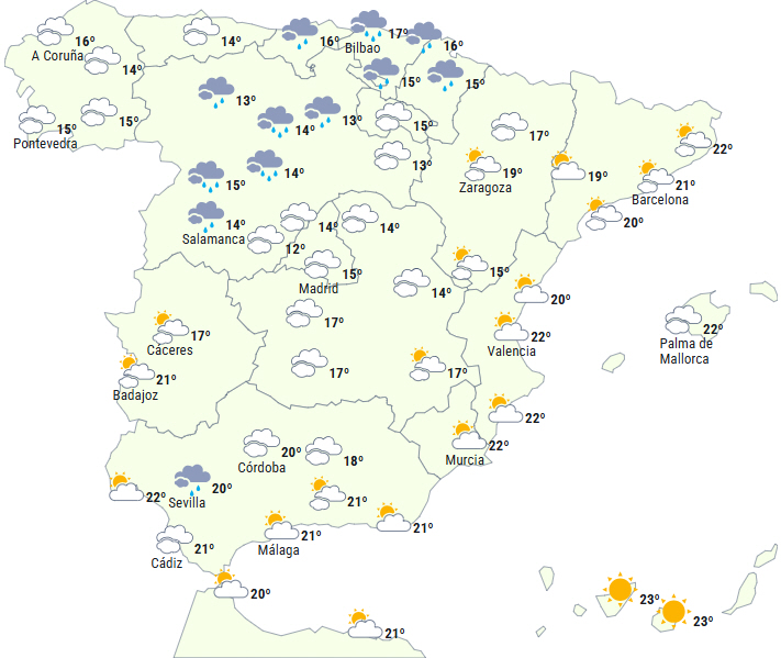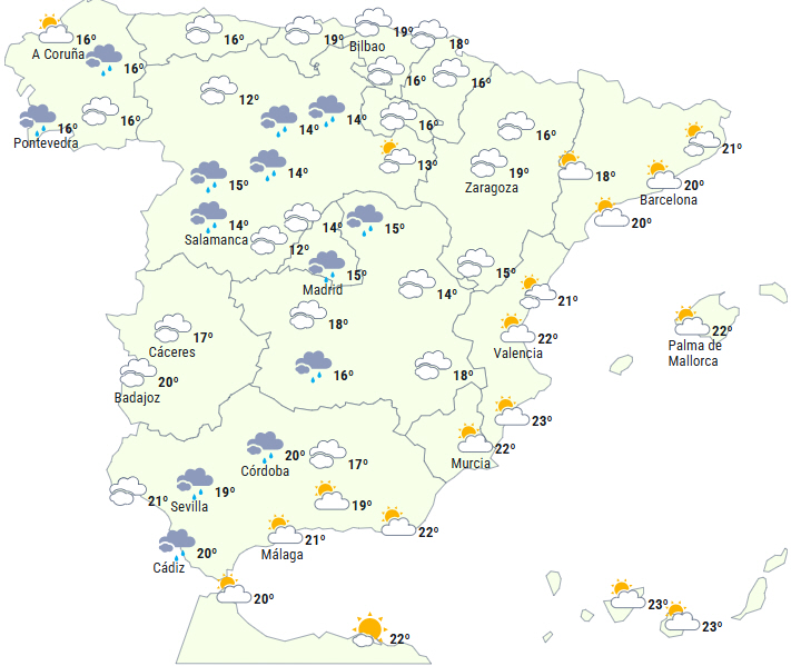 Front bevæger sig mod syd og giver nedbør og et atlantisk vejrsystem med varm og fugtig luft giver anledning til meget overskyet eller letskyet himmel over den vestlige halvdel, og det vil give nedbør, som vil være mere rigelig og vedvarende på den galiciske kyst, i det nordvestlige Castilla y León og Sistema Central.