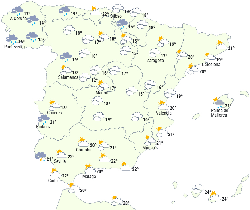 Det forudses, at en front krydser halvøen fra vest mod øst og giver overskyet himmel og nedbør på sin vej, som vil påvirke størstedelen af området. Nedbøren vil være rigelig og ledsaget af torden og måske hagl på den vestlige halvdel af Den Iberiske Halvø. Generelt svag, lejlighedsvis nedbør i resten af landet, men det ventes dog at holde tørt i den sydøstlige del og på De Baleariske Øer, hvor der er klar eller letskyet himmel.