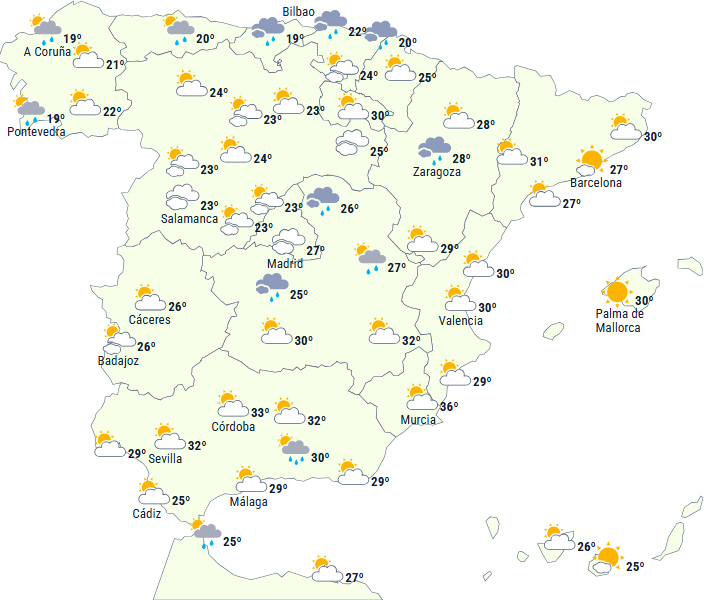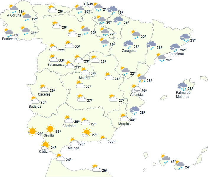 Om eftermiddagen vil ustabiliteten stige på den østlige del af halvøen og De Baleariske Øer med flere skyer, hvilket kan give byger og tordenvejr - lokalt kraftige og endda meget kraftige i Pyrenæerne og Levante-området.