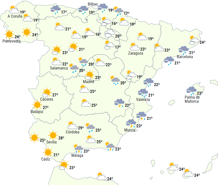 Der forventes et nyt lavtryk, som vil opretholde og øge ustabiliteten på Den Iberiske Halvø og De Baleariske Øer, og det betyder overvejende skyet eller overskyet himmel og nedbør ledsaget af torden til den østlige tredjedel og sydøstlige del af Den Iberiske Halvø samt på Balearerne. Nedbøren kan også påvirke andre områder i centrum og på den østlige halvdel.