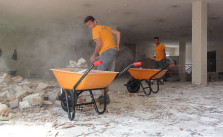 Arbejderne er i fuld gang med at brække gulvet op i det store lokale