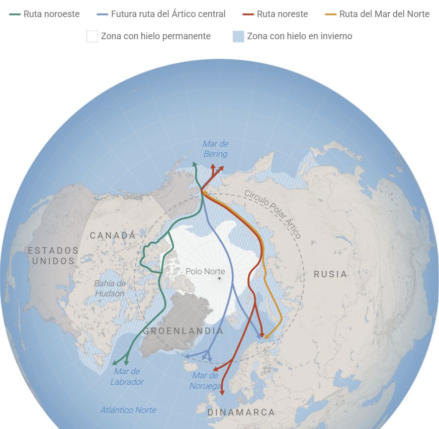 Grønland fungerer som en "hangarskib af is", der gør det muligt for USA at kontrollere indgangen til disse ruter. Artiklen beskriver indgående, hvordan kontrollen over Grønland er den eneste måde, USA effektivt kan dæmme op for den russiske militære opbygning i Arktis og de kinesiske ambitioner om en "polar silkevej". For Europa betyder det, at hvis USA overtager kontrollen, vil EU miste enhver indflydelse på fremtidens vigtigste handelsruter i nord.