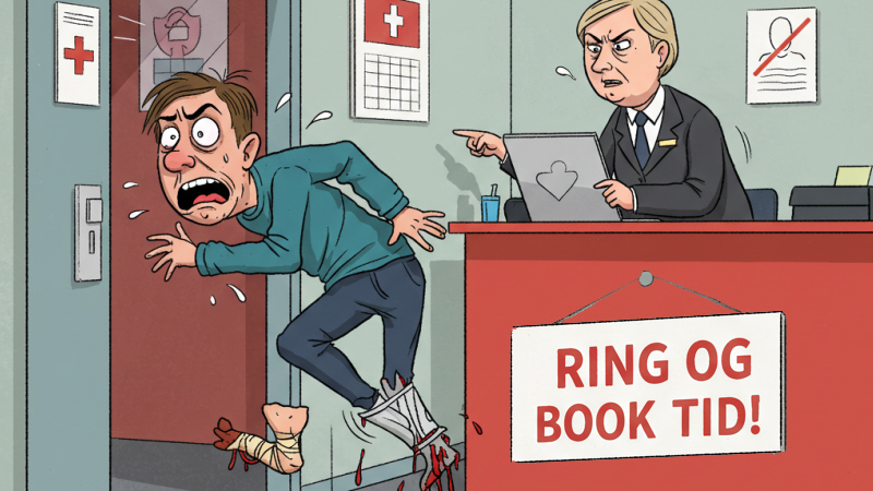 Men hvis man kommer til skade, kan man godt hælde ekstra vin op i glasset og finde tålmodigheden frem. For man kan jo ikke bare tage på skadestuen, men skal ringe først?!! Første gang jeg hørte det, troede jeg, det var en joke. Altså what?
