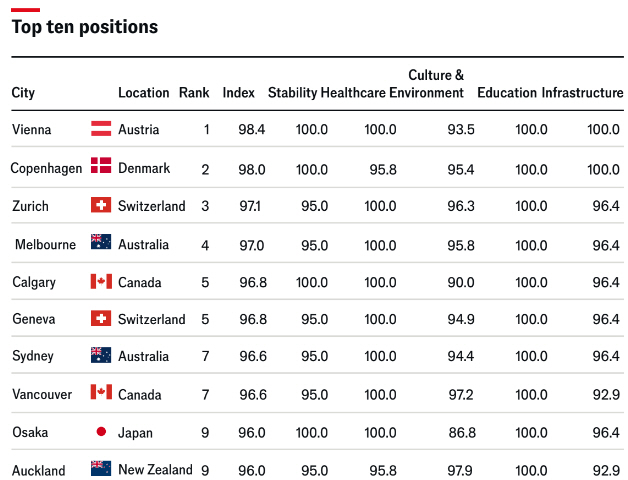 For tredje år i træk er østrigske Wien udnævnt til verdens bedste by at bo i. Byen får en perfekt score på 100 for stabilitet, sundhedspleje, uddannelse og infrastruktur, men der er plads til forbedringer inden for kultur og miljø. Her scorer byen kun 93,5 og det begrundes med manglen på store sportsbegivenheder. Samlet opnår byen en indeksscore på 98,4.