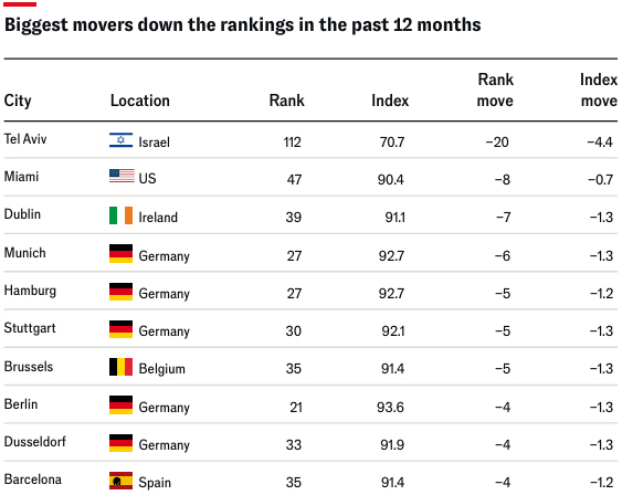 Stabilitet har oplevet den største tilbagegang af alle de fem kategorier i indekset. Stigende antal protester har ført til, at vesteuropæiske byer dominerer listen over de ti byer, der er faldet mest, mens krigen med Hamas har trukket israelske Tel Aviv hele 20 pladser ned og er den by, der er faldet mest i dette års indeks.