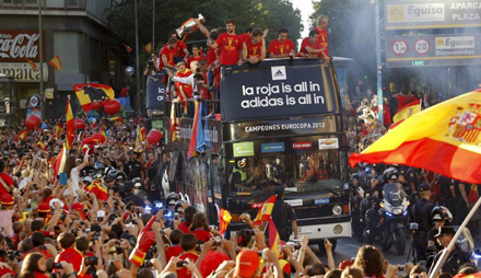 En åben bus tog spillerne med på en sejrsparade gennem den spanske hovedstad, hvor folk var stimlet sammen langs hele ruten for at få et glimt af stjernerne. På grund af den bagende sol var det nødvendigt at oversprøjte de mange fremmødte for at undgå hedeslag.