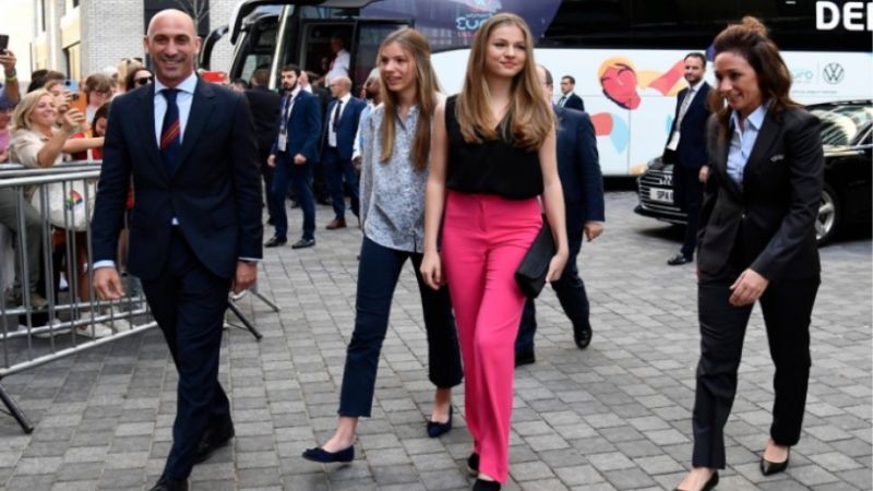 Prinsesserne ledsages af Luis Rubiales og bossen for UEFA’s kvindefodbold, Nadine Kessler
