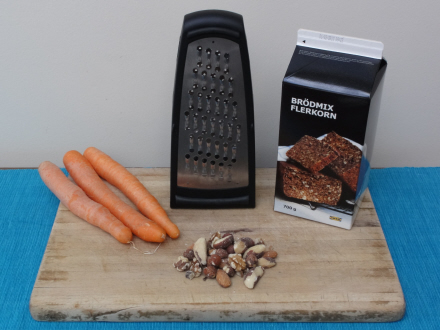 Uhmm... En karton med kærnerugbrødsmel fra IKEA, ekstra nødder, tre revne gulerødder og så lige 600 ml. lunt vand. Jeg blander det hele sa...