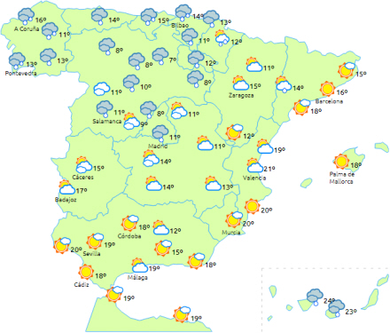 Skyet eller overskyet med nedbør i hele den nordlige ende af halvøen og på De Baleariske Øer, der lejlighedsvist bliver ledsaget af tordenbyger, lokalt stærke eller vedvarende i nordvest, det nordlige Navarra og på De Baleariske Øer.