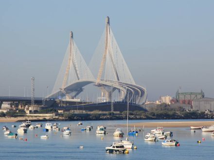 Forsidebilledet er broen ‘Puente de la Constitución de 1812’, som blev færdig 2015. Vi vil køre over den ved ankomsten til Cádiz. Den har en frihøjde for skibspassage på 69 meter, hvilket er det næsthøjeste i verden. Den højeste frihøjde har fortsat broen Verrazano Narrows over Hudson-floden i New York.