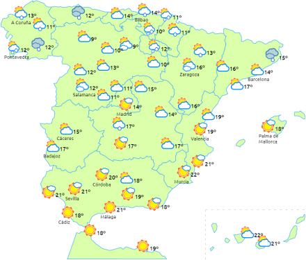 Store dele af landet vil i dag kunne nyde en letskyet himmel eller måske med højtliggende skyer. Imidlertid forventes en knapt så aktiv front at trække ind nordvestfra over halvøen, og det giver skyet eller overskyet himmel over den nordvestlige tredjedel og nedbør i Galicien og langs nordvestkysten, dog generelt svagt.