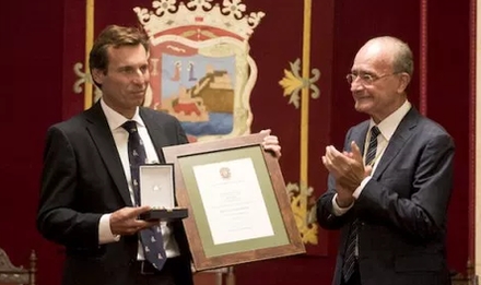 Klubbens formand Manuel Narvaez Ruiz del Portal modtager medalje og diplom af Málagas borgmester Francisco de la Torre den 20. september