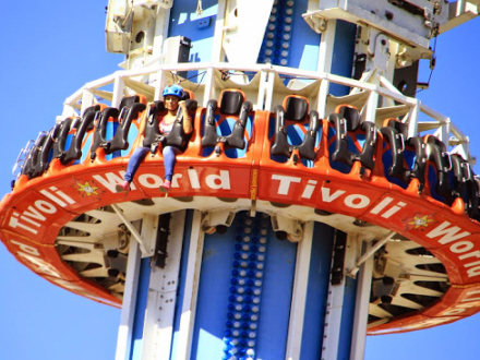 Forlystelsesparken er en miniudgave af det Tivoli, de fleste danskere kender fra centrum af København, og her er da også en udgave af Det Gyldne Tårn, som her hedder Caída Libre - frit fald.