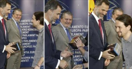 Det var kongens første besøg som monark i Europa-Parlamentet, hvor han hilste på de 54 spanske parlamentsmedlemmer, hvoraf de fem er Podemos-folk.