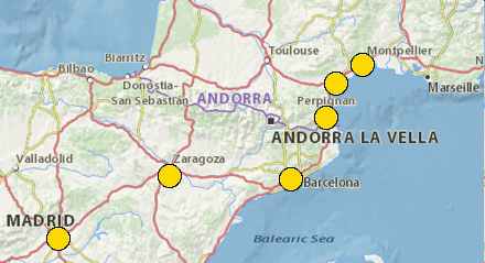 Linjen går fra Madrid til Montpelier og turen varer 5 timer og 47 minutter. Der vil være stop i Zaragoza, Barcelona, Perpignan og Narbonne
