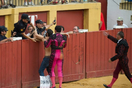 I Marbella blev Peter hurtigt tilbageholdt, mens Pedro nåede helt hen til tyrefægteren, hvor han viftede med sit banner: Stop tyrefægtning.