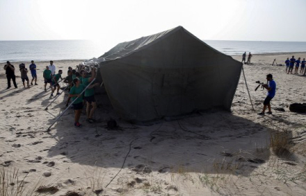 Hæren har allerede nænsomt sat et af sine telte op, der anvendes i særlige aktioner med plads til ti senge. Men her består sengen altså af sand.
