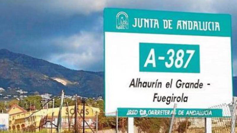 Et af de ældre vejskilte blev sat op for over ti år siden. Det står i vejkanten langs en af de mest trafikerede vejstrækninger i kommunen nemlig A-387 (Carretera de Mijas) – ikke langt fra Centro Idea midt mellem Alhaurín El Grande og – ifølge den andalusiske regering – ”Fuegirola”.