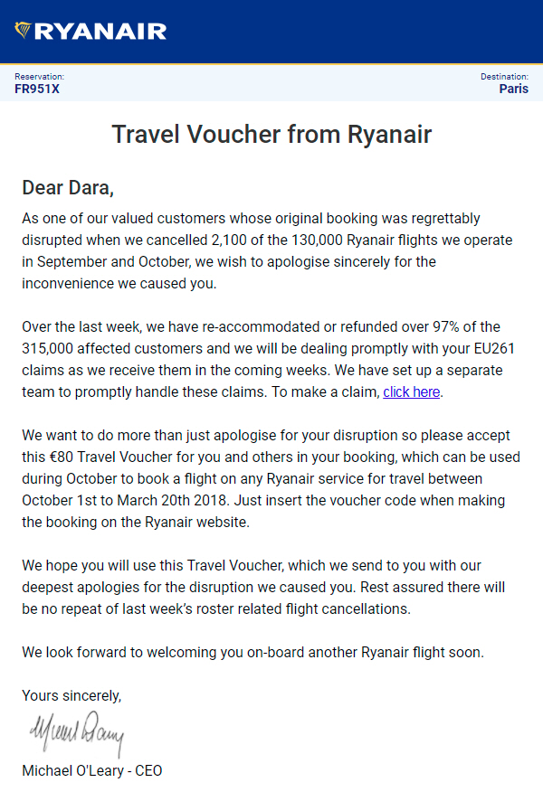 “Alle de ramte passagerer har nu tilbudt genbooking eller fuld tilbagebetaling samt deres gældende EU261-rettigheder. Derudover modtager de i dag (i går, red.) en rejsekupon (40 € enkelt/ 80 € retur), som de kan bruge til at bestille en billet med en hvilken som helst Ryanair-flyvning efter eget valg i oktober for rejser mellem oktober og marts 2018. Vi glæder os til at byde dem velkommen ombord.", lyder det fra Michael O’Leary.