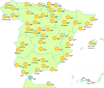 Overvejende tørt og solrigt vejr i hele landet med enkelte undtagelser. I Catalonien er der regn- og tordenbyger, der kan være ret kraftige i de tidlige morgentimer og har efterhånden tendens til at miste pusten, uden at de dog forsvinder helt.