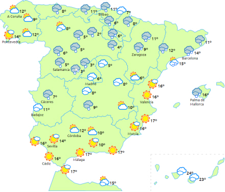 Temperaturerne falder, bortset fra at maksimumstemperaturerne kan stige i Galicien og minimumstemperaturerne på den nordøstlige del af halvøen. Der sker kun få ændringer på øerne. Generelt svag frost i bjergområderne, som vil vare ved hele dagen i de højtliggende områder i Pyrenæerne, de centrale bjerge og den sydlige del af De Iberiske Randbjerge.