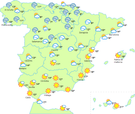 Dagstemperaturerne falder på næsten hele halvøen og Balearerne. Nattemperaturerne falder på det meste af den nordlige og østlige del af halvøen, selv om der i dale og på heder kan forekomme mindre stigninger. Også lette stigninger i den sydvestlige del, den helt sydøstlige del og i Gibraltarstrædet. Frost i bjergene på halvøen - noget kraftigere i Pyrenæerne.