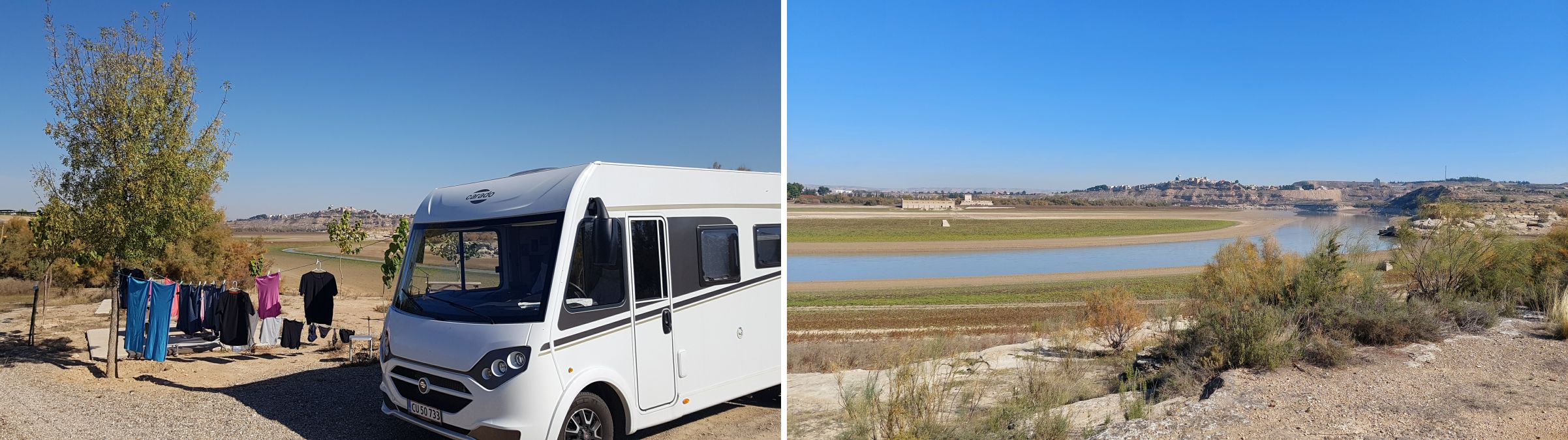 Her til morgen får vi fundet et vaskeri, hjemmet skal jo passes. Vi havde rekognosceret på vores byrundtur i aftes, så det er nemt at finde i dag. Vi fik vasket, provianteret i et supermarked og kører ud af Caspe på A-221 for at finde et sted, vi kan holde ind og tørre tøj. Og med endnu en god udsigt til Elbro tørrer tøjet hurtigt i solen. Der er ikke lige meget vand i floden alle steder, men vi syntes det er fantastiske scenarier. Vi indtager frokosten, inden vi bryder op igen med kurs mod Escatrón, hvor vi skal have tanket bilen.