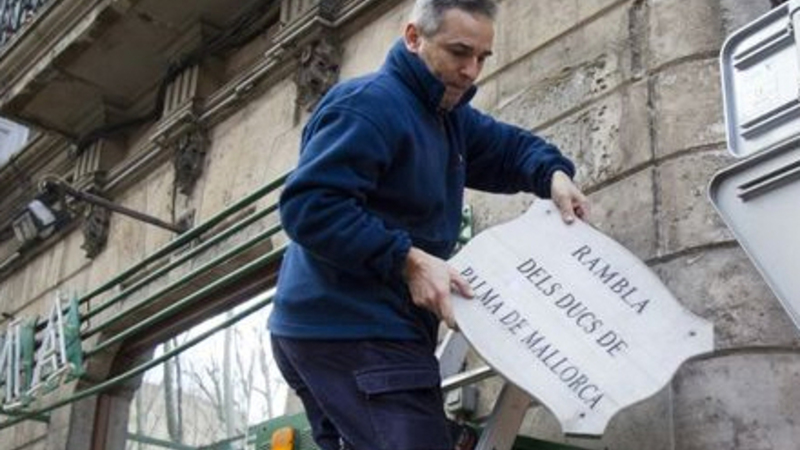 Skiltet med ”Los Duques de Palma de la Rambla” blev pillet ned fredag og erstattet med det tidligere gadeskilt La Rambla. Udskiftningen kommer efter at et flertal i kommunalbestyrelsen i Palma de Mallorca sidste måned besluttede at eliminere prinseparrets navne fra vejskiltet.