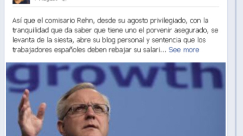 Næstformand for det socialistiske parti, Elena Valenciano, raser mod formanden for EU-kommissionens økonomiudvalg, Olli Rehn, for sit forslag om, at ”spanierne bør gå ti procent ned i løn for at redde landets økonomi”.