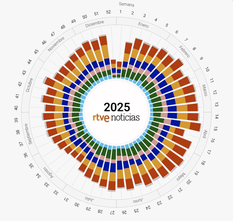 I året, hvor Spanien oplevede en stor strømafbrydelse, verden bød velkommen til en ny pave, og Trump vendte tilbage til Det Hvide Hus, har redaktionen på RTVE Noticias offentliggjort 18.285 nyheder frem til den 26. december. Det svarer til et gennemsnit på 352 nyheder om ugen (eller 51 om dagen), hvilket er på linje med de seneste år, med undtagelse af 2020, hvor coronaviruspandemien brød ud.