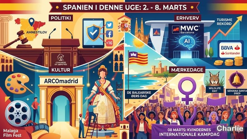 Ugen 2. - 8. marts i Spanien er tætpakket med s begivenheder på tværs af alle sektorer. Politisk dominerer debatten om amnestiloven og beskyttelse af mindreårige på sociale medier dagsordenen. Erhvervslivet samles til verdens største mobilmesse, MWC i Barcelona, mens kulturlivet blomstrer med ARCOmadrid og optakten til de store forårsfestivaler. Ugen kulminerer med fejringen af De Baleariske Øer og massive landsdækkende markeringer af Kvindernes Internationale Kampdag.