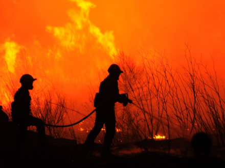 I Centralspanien deltager mere end 400 brandmænd, fly og helikoptere i slukningen af to storbrande i et skovområde i Sierra Norte i Guadalajara, øst for Madrid. Her er mere end 3.200 hektar skov og krat brændt ned.