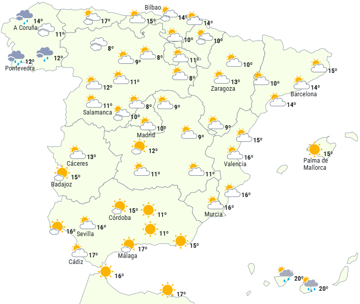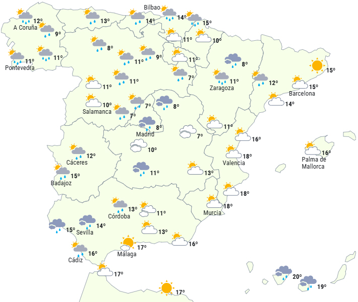 Dagen er generelt stabil på halvøen, men ankomsten af en koldfront vil give meget skyet eller overskyet himmel i nordvest. Der forventes nedbør i det vestlige Galicien og den vil brede sig til resten af området samt til det nordvestlige Castilla y León og vestlige Asturien, dog i svagere form.