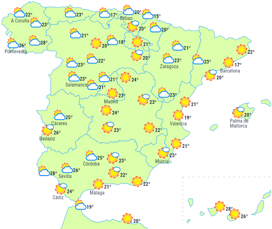 Stigende dagstemperaturer over hele linjen, men især i indlandsområderne på den helt nordvestlige del af halvøen og på De Kanariske Øer. De vil dog falde i Middelhavsområdet. Minimumstemperaturerne vil stige i den centrale vestlige og sydvestlige del af halvøen og på Tenerife og vil falde i nordvest, på den østlige tredjedel og på De Baleariske Øer. Små ændringer i resten.