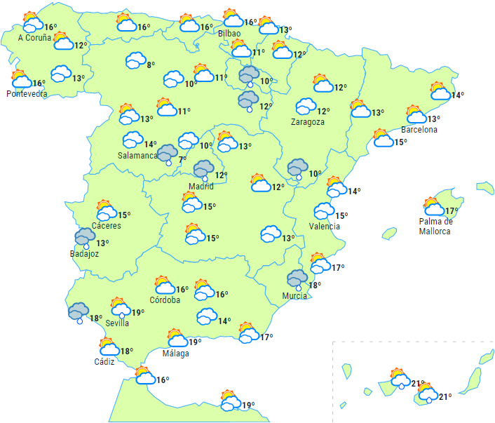 Skyet, uden at udelukke let regn i det indre af den sydøstlige del af den iberiske halvø og i området omkring Gibraltarstrædet. Overvejende delvist overskyet i resten af landet, dog med enkelte mellem- og tæt overskyet perioder i Galicien og lav skydække på Balearerne og i resten af den sydøstlige kvadrant. På De Kanariske Øer er der stigende overskyet i den østlige del af øgruppen, hvor svag nedbør ikke udelukkes, som kan ledsages af tordenvejr. Der er kun lidt overskyet i resten af øgruppen, med mulighed for lidt let regn på Tenerife.