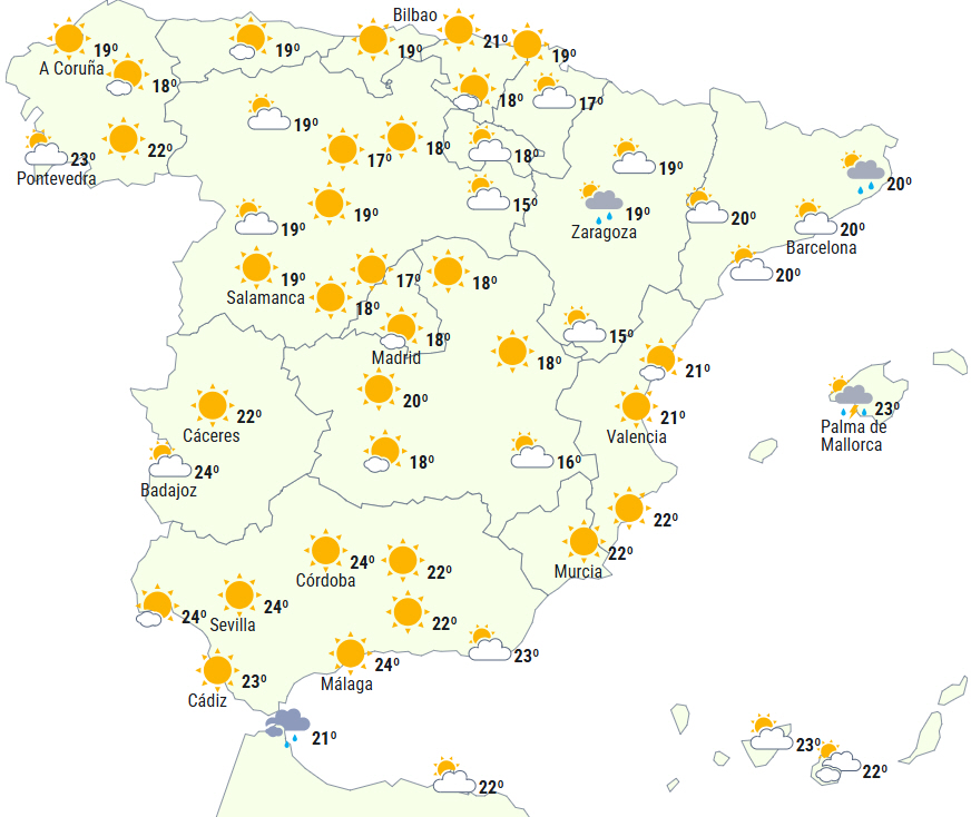 Om eftermiddagen vil der udvikle sig flere skyer i halvøens indre områder, og det kan kaste både regn- og tordenbyger af sig i bjergene i det centrale og den nordlige og østlige tredjedel -mere intense og endda lokalt kraftige i områder af Pyrenæerne og De Iberiske Bjerge.