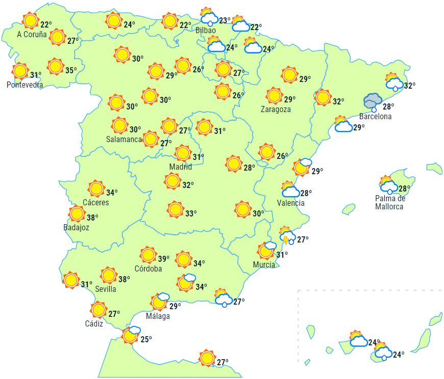 Om eftermiddagen, hvor der bliver mere skyet over fastlandets østlige tredjedel, er der sandsynlighed for byger og tordenvejr i Pyrenæerne, Catalonien og i kyst- og præ-kystområder i den sydøstlige og sydlige del af Valencia-regionen.