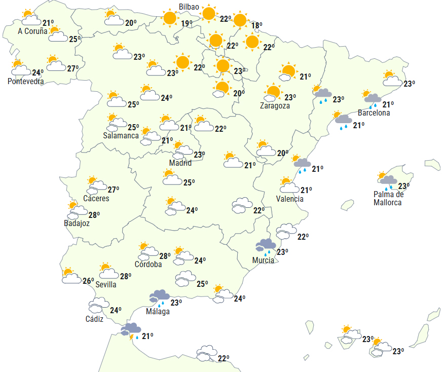 Der forventes letskyet himmel fra dagens første timer, og byger kan ikke udelukkes ved kysten af Catalonien og omkring Valencia-bugten. Ligeledes vil middel- og højtliggende skydække øge fra sydvest, hvilket betyder overskyet himmel over den sydlige halvdel.