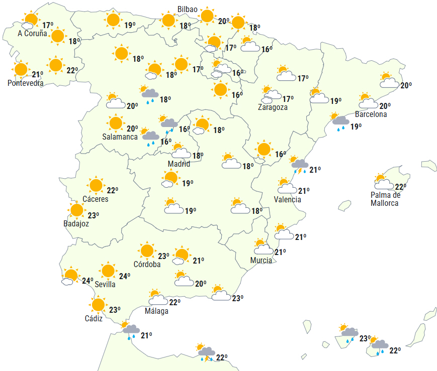 Det forventes, at ustabiliteten på halvøen fortsætter. Det betyder overskyet vejr med lavthængende skyer over den østlige del af halvøen, Ebro-dalen og den cantabriske kyst i løbet af dagens første halvdel, og vi kan heller ikke udelukke regnbyger på Middelhavskysten.