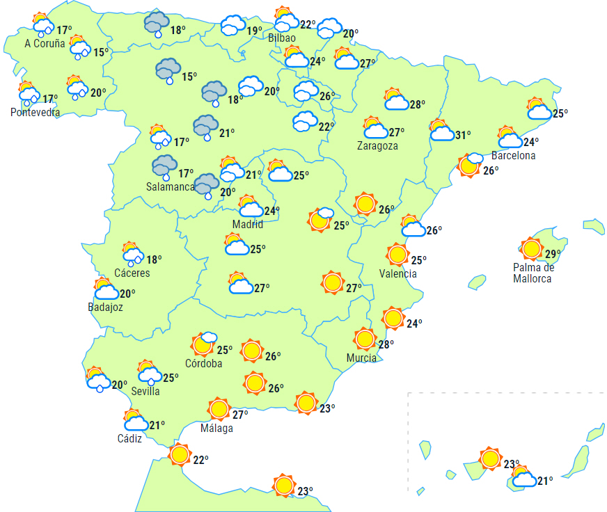 Overvejende letskyet himmel og tørvejr over den østlige og sydøstlige tredjedel af halvøen samt på De Baleariske Øer, men der kan måske komme nogle byger om eftermiddagen i de vestlige Pyrenæer og de omkringliggende områder mod syd.