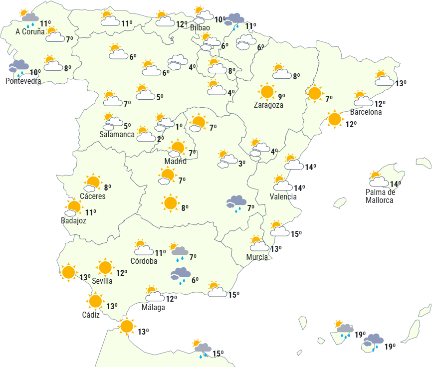 Fronten, som kom ind den foregående nat fra nordvest, vil krydse Den Iberiske Halvø og give skyet eller overskyet himmel undtagen på Middelhavssiden og De Baleariske Øer, hvor der vil være letskyet.